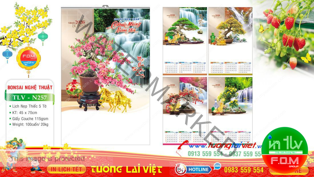 Lịch 5 tờ nẹp thiếc thường được in Offset 1 mặt trên giấy C105gsm, có kích thước: 36×70 và 45x70cm. Lịch 5 tờ Cây cảnh là mẫu lịch tờ treo tường giá rẻ nên được nhiều cửa hàng nhỏ lẻ chọn in lịch tết năm nay để làm quà tặng cuối năm cho khách hàng, bạn bè, đối tác và người thân nhân dịp năm mới.