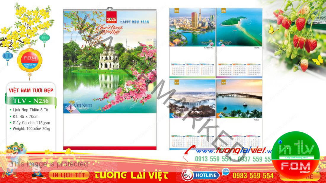 Lịch 5 tờ nẹp thiếc thường được in Offset 1 mặt trên giấy C105gsm, có kích thước: 36×70 và 45x70cm. Lịch 5 tờ Thắng cảnh là mẫu lịch tờ treo tường giá rẻ nên được nhiều cửa hàng nhỏ lẻ chọn in lịch tết năm nay để làm quà tặng cuối năm cho khách hàng, bạn bè, đối tác và người thân nhân dịp năm mới.