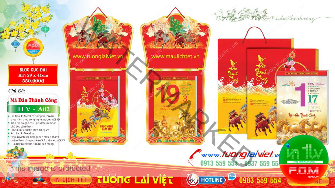 Lịch bloc siêu cực đại Mã Đáo Thành Công là Lịch bloc khổ A3 kích thước 30×40 có in logo doanh nghiệp được nhiều đơn vị chọn làm quà tặng cho khách hàng, bạn bè, đối tác và người thân nhân dịp năm mới. Mẫu Lịch bloc siêu cực đại Mã Đáo Thành Công được in theo công nghệ mới nhất như: Khánh Lịch được In Metalize, Phun Nhung, Ép Kim, Bế Nổi, Dán Nổi, Bìa Sơn Mài hay Bìa làm bằng gỗ Laminate tráng gương bóng kính hay còn gọi là Lịch gỗ Laminate.